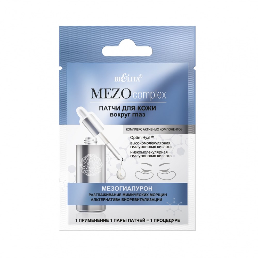 Патчи для кожи вокруг глаз «Мезогиалурон» действуют по технологии безинъекционной ревитализации кожи, позволяющей защитить от преждевременного старения, разгладить морщины, восстановить водный баланс. Optim Hyal™ стимулирует синтез гиалуроновой кислоты, глубоко увлажняет кожу, разглаживает сетку микролиний, увеличивает эластичность кожи вокруг глаз. Tens’up™ усиливает видимый эффект подтягивания, оказывает длительное антивозрастное действие на кожу вокруг глаз. Высокомолекулярная гиалуроновая кислота эффективно увлажняет верхние слои кожи, уменьшает выраженность морщин. Низкомолекулярная гиалуроновая кислота, благодаря небольшому молекулярному весу, проникает в кожу, способствует синтезу коллагена и эластина, стимулирует выработку гиалуроновой кислоты, оказывает эффект мгновенного лифтинга, уменьшает глубину морщин. Комплекс из экстрактов хвоща, плюща и манжетки оказывает противоотечное и тонизирующее действие на кожу вокруг глаз, защищает от свободных радикалов.