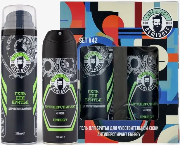 Состав набора: Гель для бритья для чувствительной кожи 200 мл Антиперспирант Energy 48 часов 200 мл Выполненный в стильном геометричном дизайне, набор уходовых средств Architect Demidoff станет идеальным подарком для любого современного мужчины. Гель для бритья обеспечивает гладкое чистое бритье, смягчает и успокаивает кожу, защищает от раздражения и дарит ощущение свежести. Экономично расходуется и подходит для чувствительной кожи. Антиперспирант предотвращает появление пота и запаха, быстро впитывается, сохраняет ощущение свежести в течение 48 часов, дарит приятный аромат. Подарочный набор уходовой косметики это идеальный выбор для тех, кто ищет подарки на день рождения или любые другие праздники. Подарочный набор для ванны содержит все необходимое для ухода за волосами, кожей тела и лица. В подарочном наборе для волос представлены различные продукты для здоровья, блеска и сияния волос. Эти продукты содержат качественные ингредиенты, которые не только ухаживают за волосами, но и обладают ароматными запахами, которые добавят вам уюта и удовольствия. Подарочный набор для тела содержит различные уходовые позиции для увлажнения и питания кожи. Подарочный набор для макияжа содержит продукты, которые помогут вам создать идеальный макияж на любые случаи жизни.