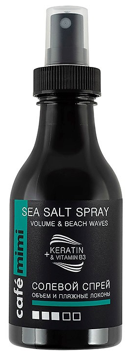 Солевой спрей CAFÉ MIMI с минералами морской соли - идеальное средство для создания непринужденных объемных укладок в «пляжном» стиле. Спрей придает волосам плотность и объем, создает идеальный пляжный образ и обеспечивает легкую надежную фиксацию. Морская соль и кератин оказывают укрепляющее и восстанавливающее действие на структуру волос, придают им жизненную силу и матовый финиш. Экстракт морских водорослей и Витамин B3 питают и увлажняют волосы.