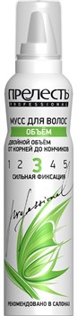 Мусс для укладки волос прелесть Professional ОБЪЕМ с натуральными ингредиентами 160 мл. Средство для укладки волос придаем волосам удивительный объём, наполнить их густотой и красотой - всё это под силу профессиональному средству для волос Объём от ПРЕЛЕСТЬ Professional. Отныне со средством для укладки волос, причёске не страшна деформация, непогода, влажный воздух и различные непредвиденные обстоятельства. Со средством для укрепления волос на протяжении всего дня вы сможете любоваться своим отражением в зеркале, радоваться объёмным, сильным и живым волосам. Экстракт цветков кактуса в составе профессиональных средств для волос увлажнит волосяную луковицу, а провитамин В5 подарит блеск и силу даже сильно повреждённым волосам. Профессиональный мусс для волос сильная фиксация подарит двойной объём укладке, содержит натуральные ингредиенты, которые защитят здоровые волосы от повреждений, обладает специальным UV-фильтром, который обезопасит от негативных факторов окружающей среды.
